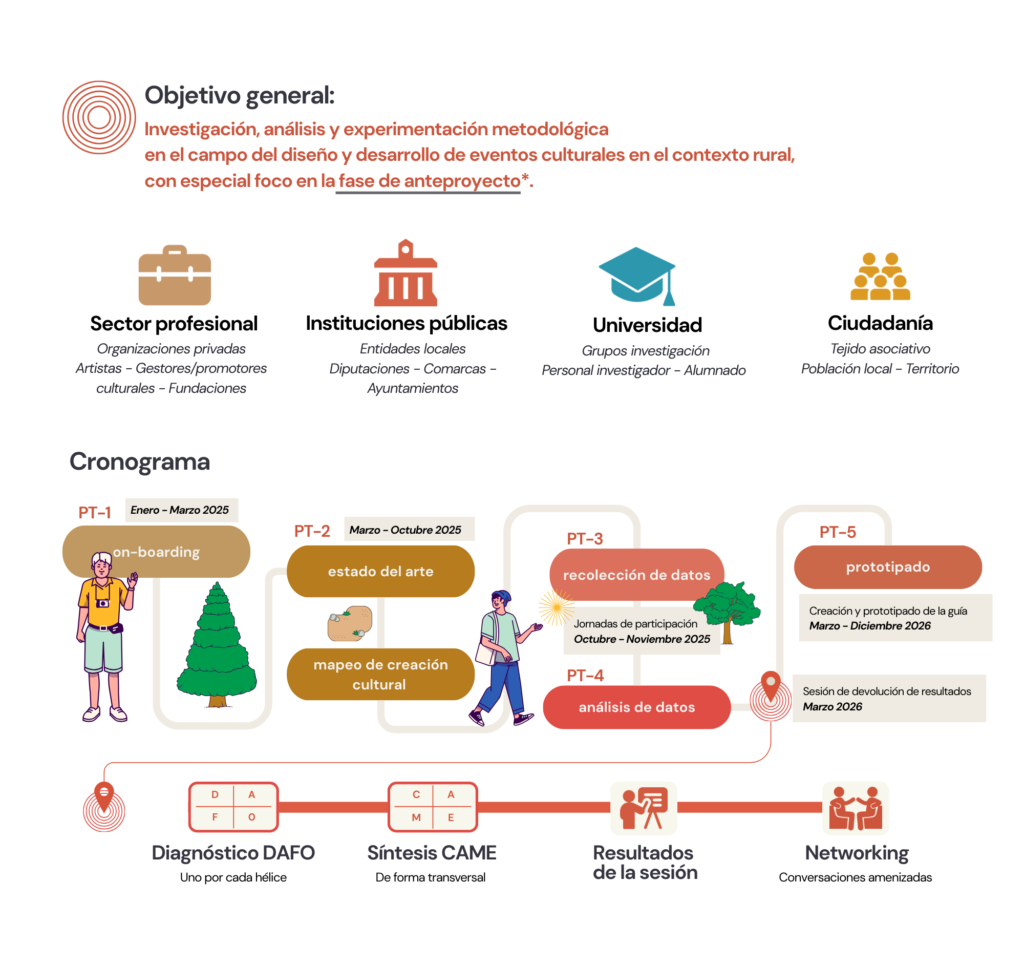 Trabajamos desde un modelo de innovación social de cuádruple hélice (ciudadanía, entidades públicas, profesionales y academia), combinando trabajo por perfiles y contraste intersectorial.